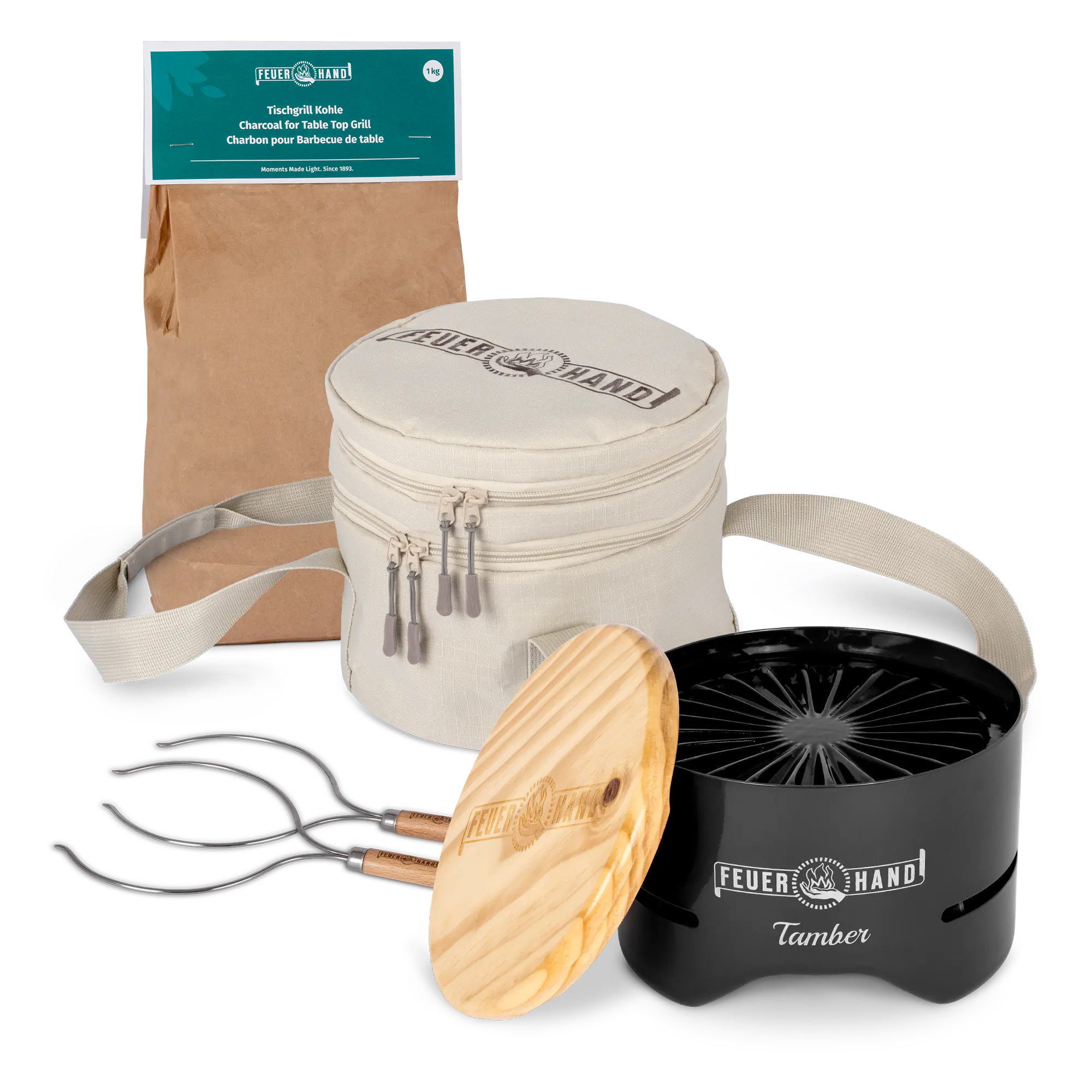 Grill, Grillspieße, Kohle und eine Tragetasche sind alles was du für deinen Grillabend brauchst. Das Starterset kommt mit dem kompakten und nahezu rauchfreien Tamber, zwei perfekt passenden und leicht zu reinigenden Grillspießen sowie einer Tasche und genug Kohle für ca. 10 mal grillen!