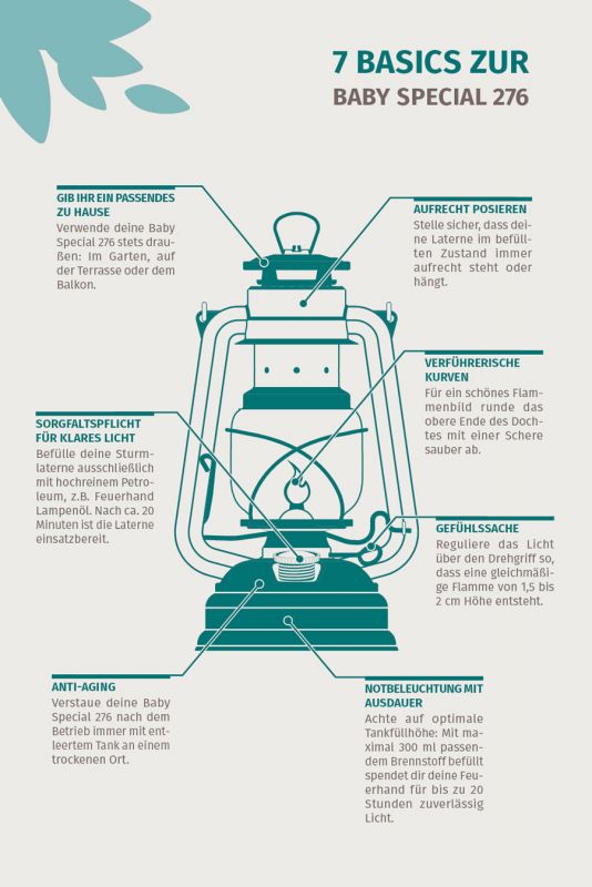 Die Sturmlaterne ist eine Petroleumlaterne und wird, wie alle Petroleumlaternen, mit einem Flüssigbrennstoff (Petroleum) betrieben. Damit versorgt dich die Sturmlaterne unabhängig von jeder Stromquelle zuverlässig und langanhaltend mit Licht. Die Baby Special 276 ist wohl die bekannteste unter ihnen und wurde bereits in frühen Jahren zur Straßen- oder Baustellenbeleuchtung genutzt. Noch heute wird die Sturmlaterne Baby Special 276 in Deutschland hergestellt. Das einfache und effektive Prinzip trifft den Zeitgeist mit Nachhaltigkeitsanspruch auf den Punkt. Das Besondere an der Sturmlaterne ist ihr offenes System, das auch als Kaltluftsystem bezeichnet wird und die Flamme kontinuierlich mit Sauerstoff versorgt, sodass sie dauerhaft am Leben gehalten wird.