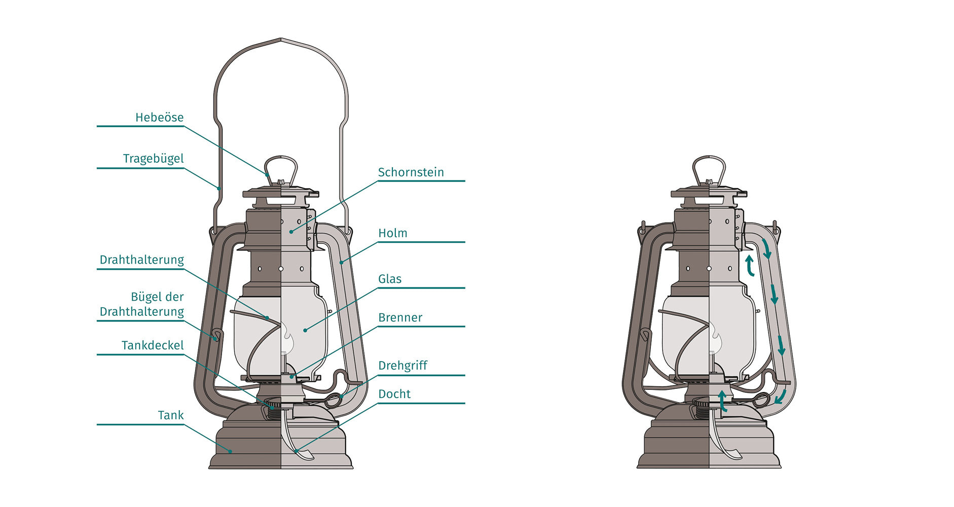 - Die Holme werden durch die abstrahlende Wärme der Laternenflamme und die des Glaszylinders erwärmt. Die Wärme wird an die in den Holmen befindliche Luft übertragen. So gelangt erwärmte Luft über die Holme bis hinunter in den Tank und dem Brenner