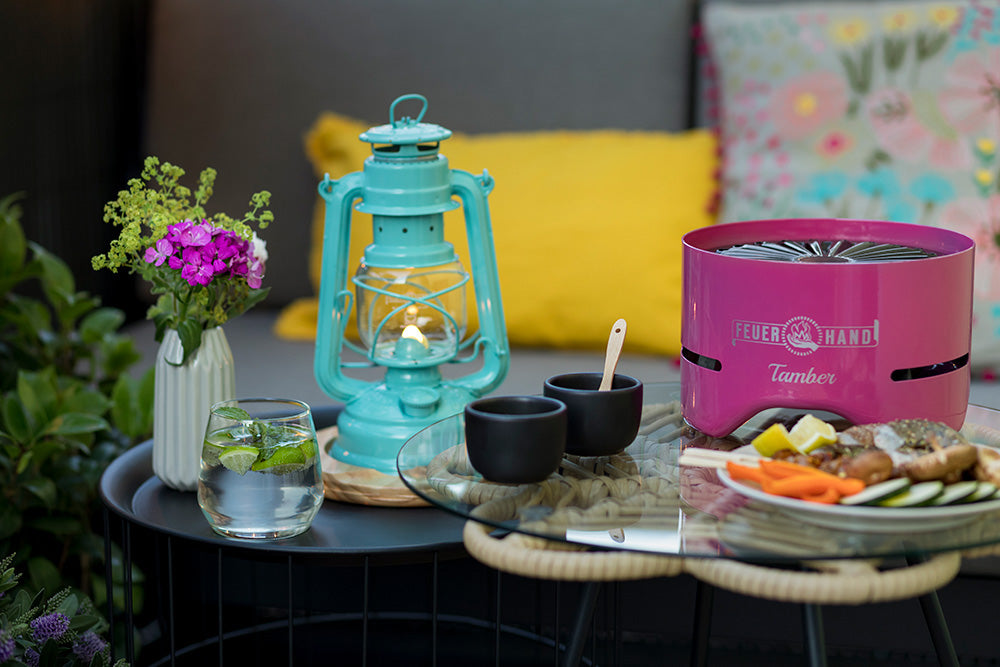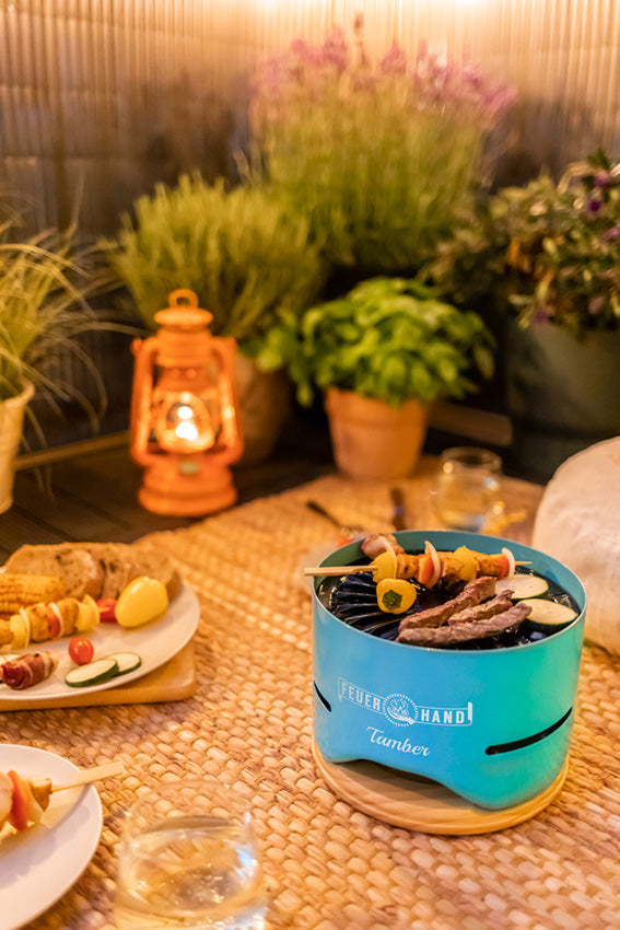 Mit dem Feuerhand Tischgrill Tamber wird das Grillen kleiner Köstlichkeiten zu einem ganz besonderen Genuss. Der Tischgrill wird einfach auf dem festlich gedeckten Balkon- oder Terrassentisch aufgestellt und so kann sich jeder genau das grillen, was er mag. Dank seines eleganten Designs fügt sich der Tamber mühelos in die Tischgestaltung ein und wird zum Hingucker auf Balkon und Terrasse. Durch seine raucharme Brennweise ist der Tamber ideal für gemeinsame Treffen zu zweit geeignet, um Gegrilltes mit dem Aroma von echter Kohle zu genießen. Das Platzieren von Appetithäppchen auf dem Emaille-Grillrost wird zu einem entspannenden Erlebnis, das bei einem schönen Glas Wein genossen werden kann. Durch den Deckel wird der Tamber zu einem sicheren Tischgrill, denn die Oberfläche des Tisches wird geschützt. Im Anschluss an das Essen zu zweit kann die Sturmlaterne Baby Special 276 für ein zuverlässiges Licht sorgen, denn sie passt perfekt auf den Deckel des Tamber. Danach kann der Abend gemütlich ausklingen.