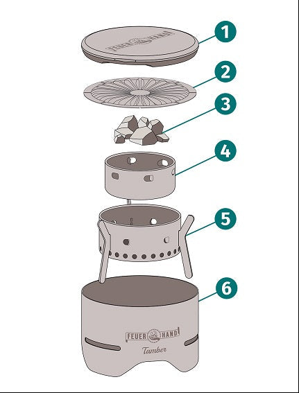 Unser kleiner Grill ist sehr durchdacht - Deckel (1) verschließt den Tamber vor & nach der Nutzung und dient gleichzeitig als Hitzeschutz-Untersetzer. Der Grillrost (2) ist so konstruiert, dass Luft gut fließt und dein Grillgut bestmöglich Hitze erhält. Unsere Kohle (3) benötigt keinen Grillanzünder und brennt effektiv & nahezu rauchfrei. Kohleschale (4), Ascheschale (5) und Gehäuse (6) sind aus Stahl und Edelstahl gefertigt, so sind sie robust, leicht und aufgrund des Designs sorgen sie für super schnelle und effiziente Verbrennung.