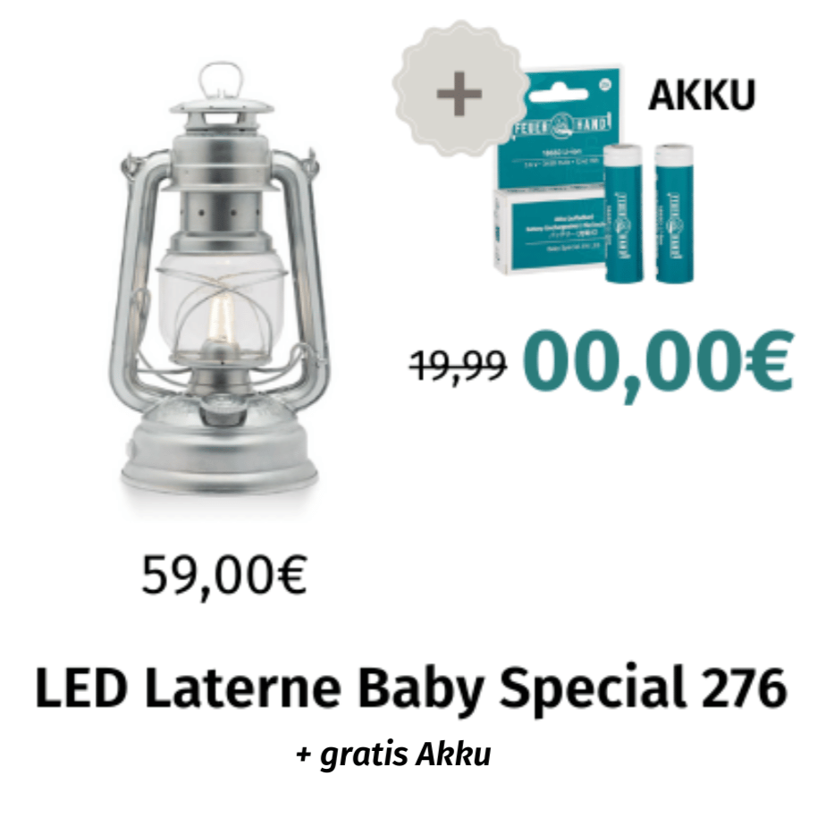 Zu jeder LED Laterne schenken wir dir den passenden Akku im Wert von 19,99€!