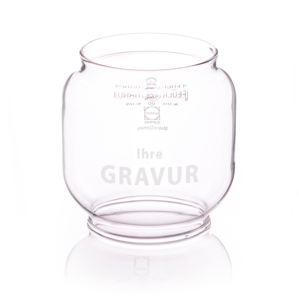 Ein persönliches Geschenk für deine Liebsten oder eine besondere Erinnerung an einen einzigartigen Moment: Lass das Glas deiner Sturmlaternen mit einem individuellen Logo, Schriftzug, Namen, Datum oder Lebensmotto verzieren und überrasche damit deine Freunde, Familie oder Geschäftspartner und -kunden. Schon ab einer Bestellmenge von 10 Sturmlaternen bringen wir hochwertige Lasergravuren auf deine Gläser, damit du deinen Lieblingsmenschen und -kunden eine ganz besondere Freude machen kannst. Schreib uns gern eine E-Mail für deine individuelle Beratung und ein Preisangebot. Gravuren für deine persönliche Feuerhand Sturmlaterne sind sowohl auf unseren transparenten Gläsern als auch auf matten Gläsern umsetzbar.