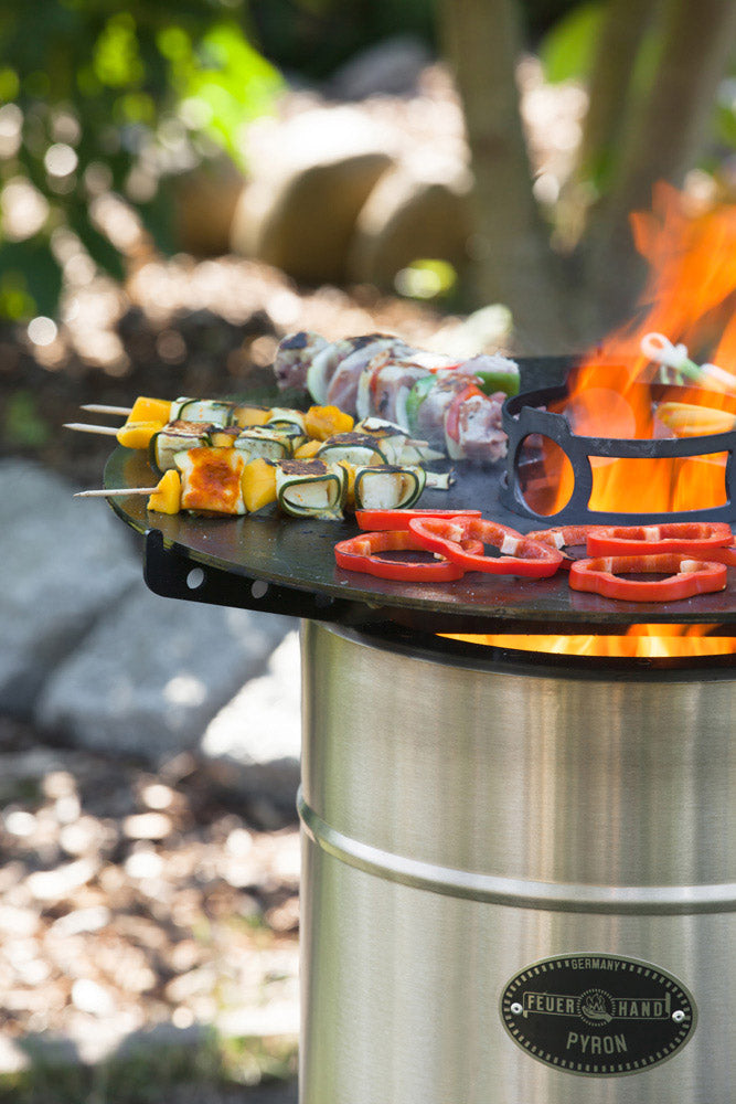 Die Grillplatte von Feuerhand aus deutscher Herstellung ist in Kombination mit der Feuertonne Pyron oder der Feuerschale Tyropit ein moderner Grill der Extraklasse. Damit setzt du ein designstarkes und geschmackliches Statement und holst die Raffinesse echter Grillexperten einfach zu dir nach Hause.